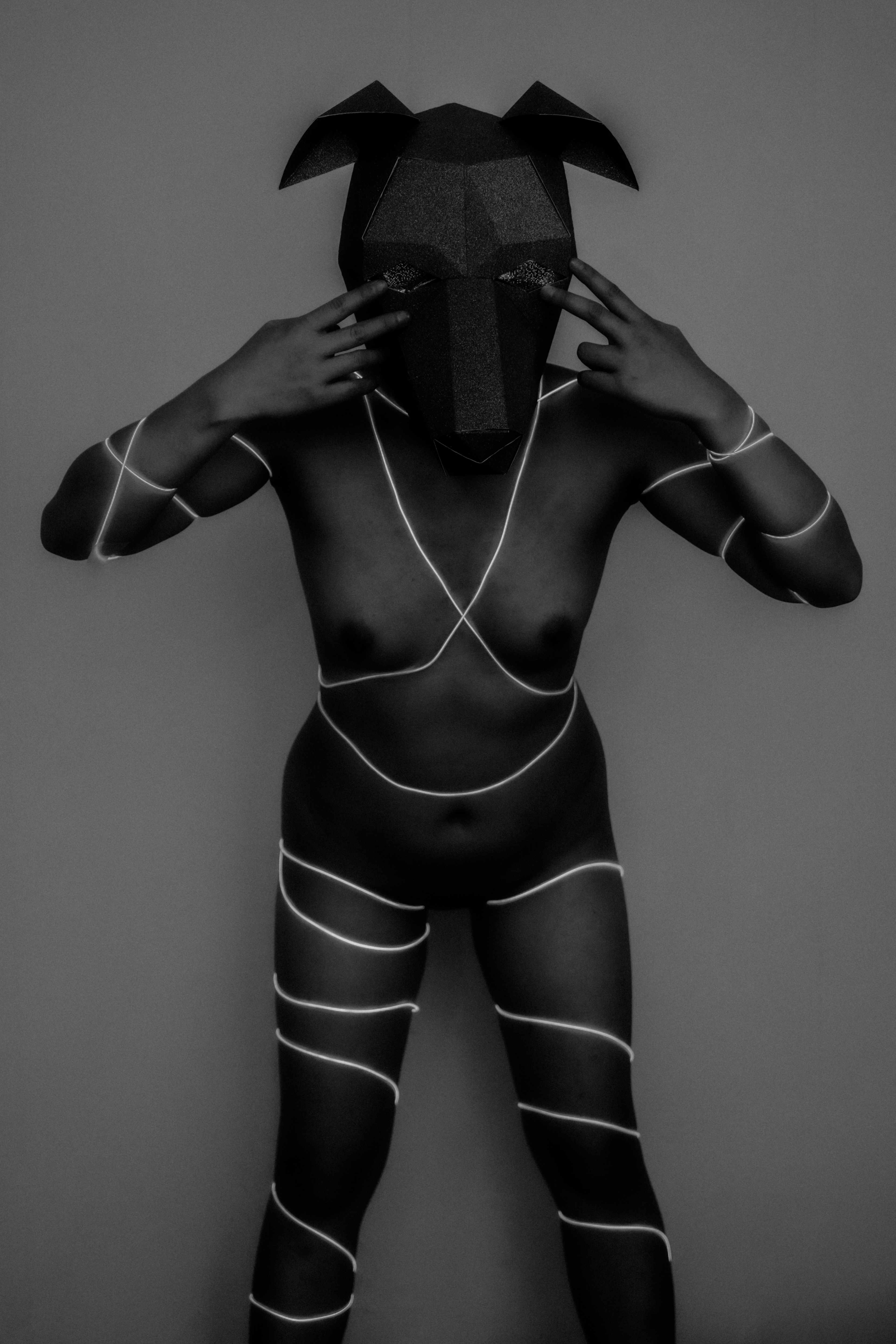 Creative photography with Dog mask & Neon Light Photo Colour in Black & White